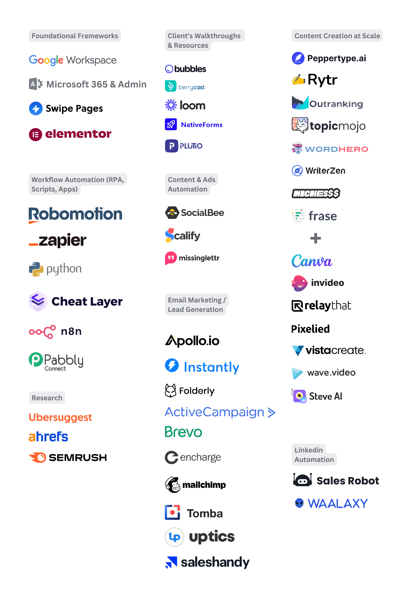 Dive into our tech galaxy that powers our agency — a curated constellation of tools designed to supercharge every aspect of your digital marketing universe. From crafting compelling content with AI geniuses like Peppertype and Rytr, to automating workflows with the robotic precision of Robomotion and Zapier, our stack is geared to launch your campaigns into orbit. And for the data-driven strategists, SEMRush and ahrefs are the telescopes to your starry SEO sky.