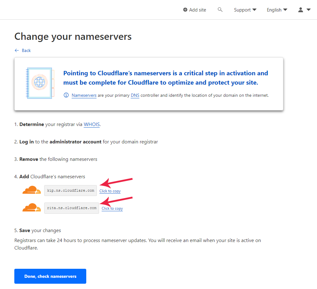 6. Our aim is to reach this page (destination), showing the nameservers. We just need to copy these two nameservers, and update our domain with these two.