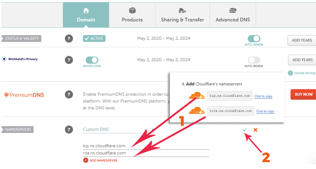 8. Now update the "Nameservers" provided by the Cloudflare as shown in the pic and click "Green Checkmark" to save it.