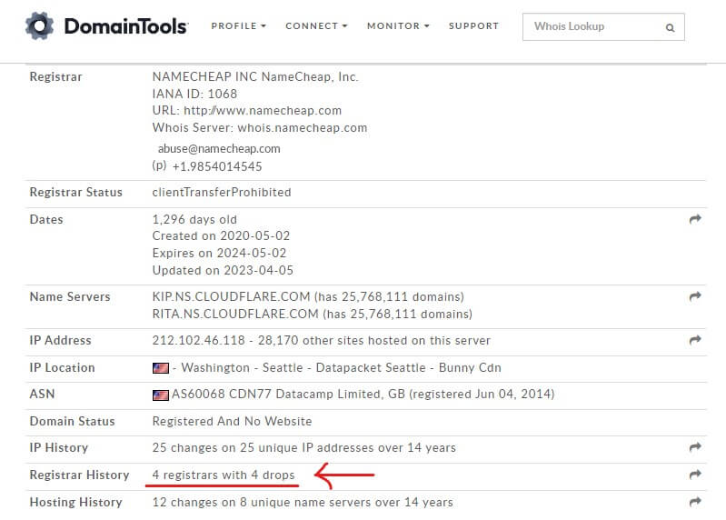 Take a look – if you see something like 4 Registrar Changes, it's a red flag. This could indicate whether someone has previously burned your domain.